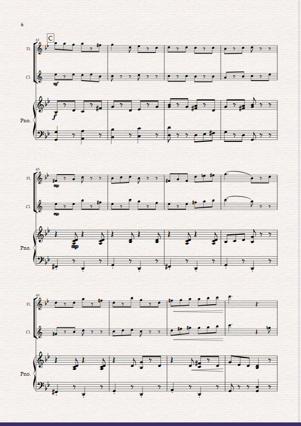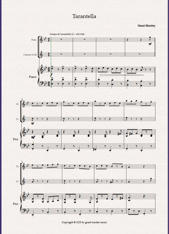 This Tarantella like most, is energetic and full on most of the time. There is some respite in the middle where eighth note movement calms down but not for long as the main theme returns to a coda section to finish with a flourish! The tempo should be (but doesn't have to be!) between 122-128 dotted quarter note as indicated to be in line with this style. I have kept the instrumental parts as equal as possible, but I have included a minimal amount of phrasing as I have left this option to the performers.