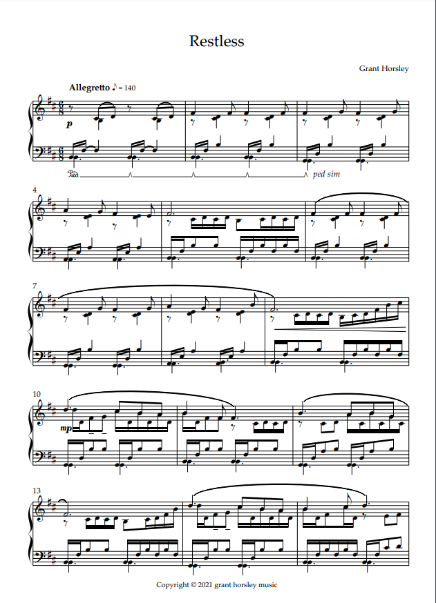 Restless is a very unsettled piece in B minor and in ternary form- Starting the main section slowly gathering pace into a turbulent Piu mosso section (the restless). Then comes a more relaxed middle section for contrast but still has an element of disturbance about it- this flows in continual quaver movements to bring the piece back to the Piu mosso section once more before coming to a conclusion.