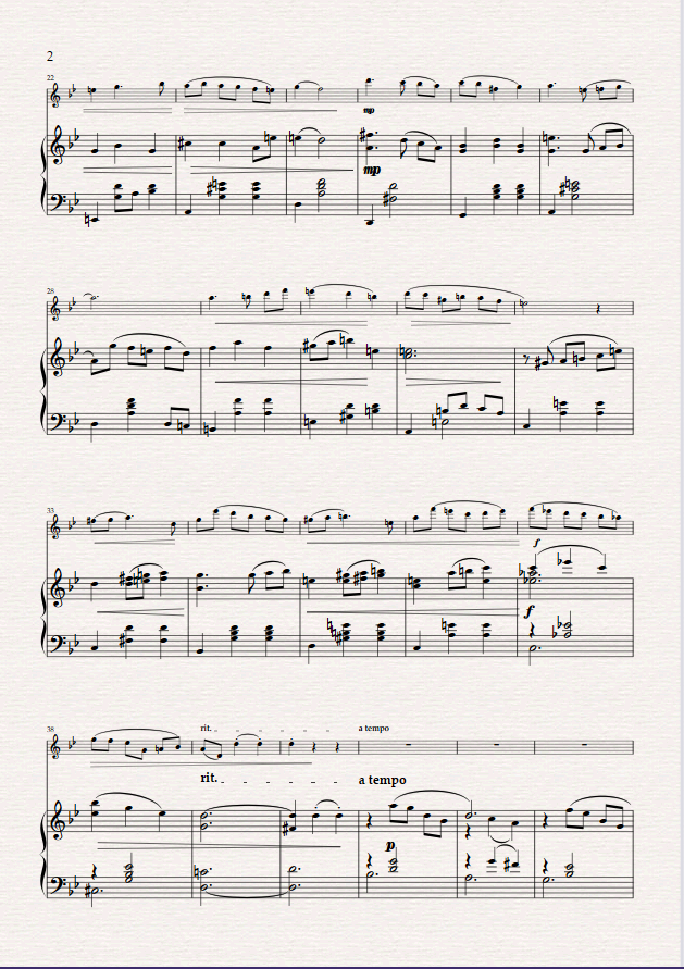 It is romantic in nature- originally intended as a piece for classical ballet, however it was decided on a concert piece. It is written in the key of G minor for the first two sections. The first time through the violin has the melody and the second time the piano takes the melody whilst the violin embellishes the theme. After a short link it arrives in G major and the same format takes place with variations of the embellishments before a small coda section to finish. I wanted the piece to sound through-composed with just the two sections. It is also more of a duet between violin and piano with both sharing the material.