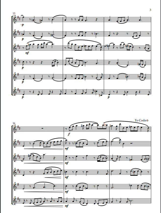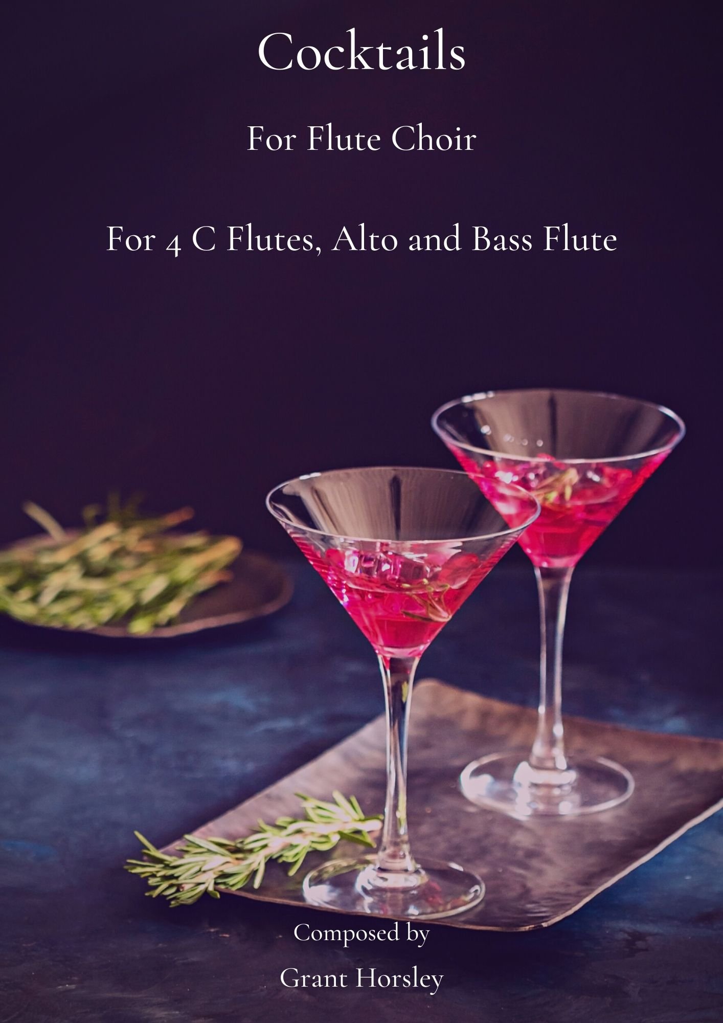 Cocktails is a lazy, bluesy, jazzy relaxing style piece scored for 4 C flutes, Alto and Bass flute. It is in a relaxed 12/8 with plenty of lush harmonies. It is in concert D major in ternary form (middle section in F major) and a small coda.