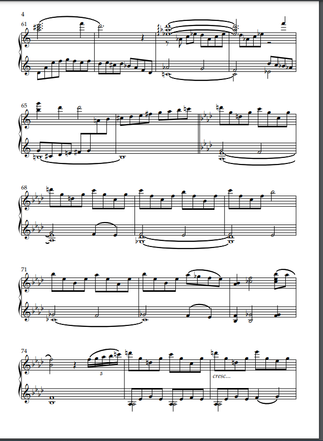 The middle section breaks out in A flat major into some tonality, but this is largely dominated by discords again and won’t let the piece settle. Then comes a few bars of sustained chords to act as a link and to return to section one. This time is has continual eighth note movement in the left hand and the piece ends again with a few eerie discords before the final flourish.