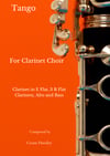 This Tango for Clarinet choir is for 6 parts- Clarinet in E Flat, 3 B Flat Clarinets, Alto and Bass. It is in concert E minor- It has 3 sections with the middle section in E major before returning back to E minor.