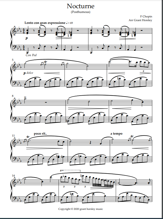 This is a very famous Nocturne- used at many concerts and recitals. This version originally in C sharp minor has been carefully arranged into C minor. Some large stretches have been avoided as has big chords.