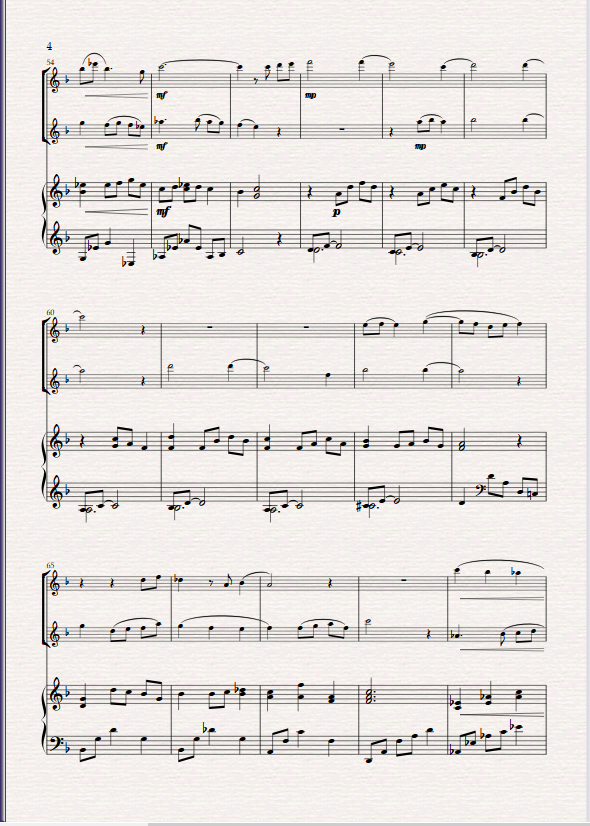 Ideal for Christmas, Weddings, Concerts etc, Scored for 2 flutes and piano with both instrumental parts equally sharing the material. It's not unlike a barcarolle in tempo and mood- although there are elements of folk and romantic ideas present. It is designed to be restful and peaceful- It is in ternary form with a 4 bar intro and a similar outro.