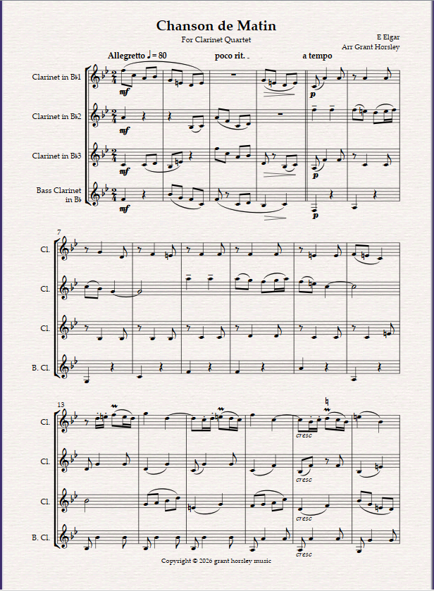 Chanson De Matin by Edward Elgar arranged here for Clarinet Quartet.(3 Bb Clarinets and Bass Clarinet)
