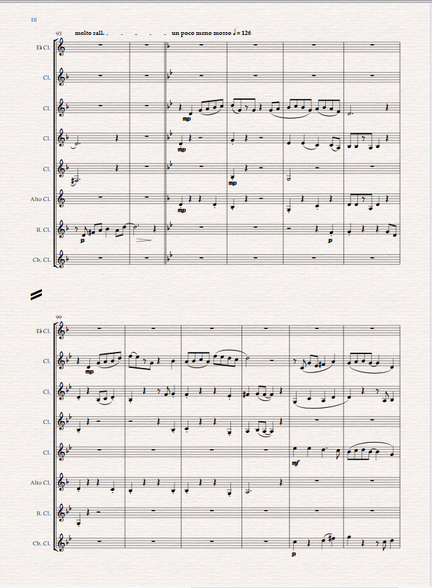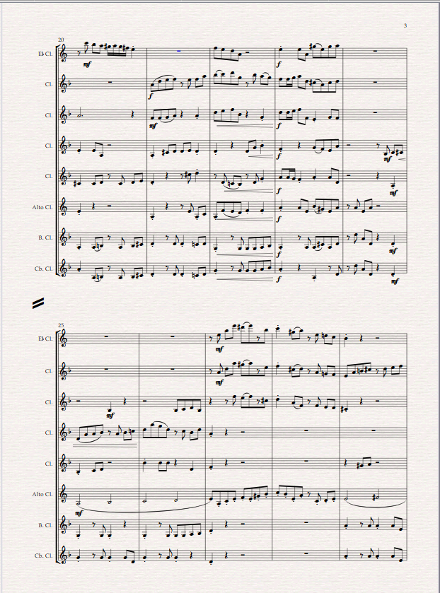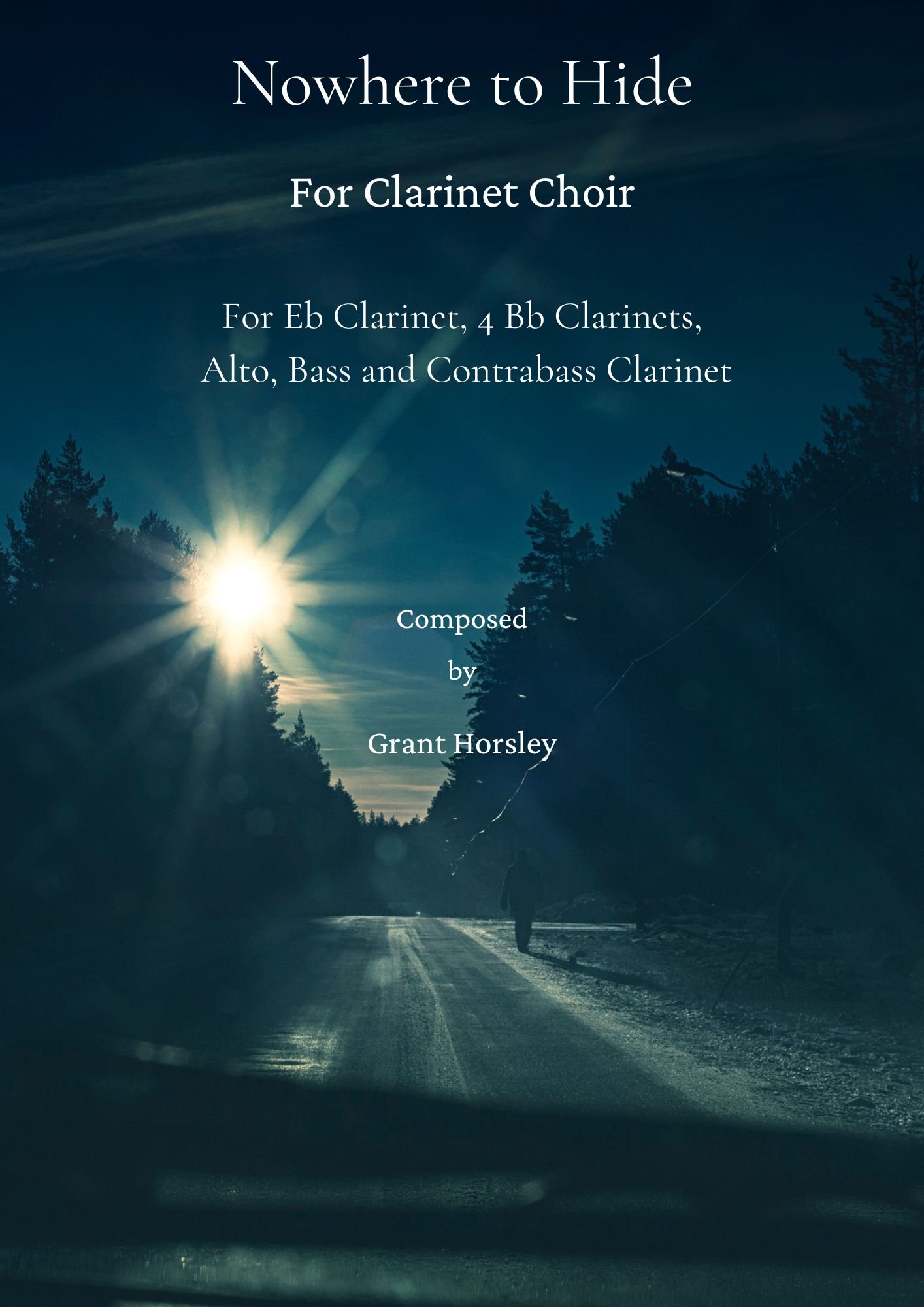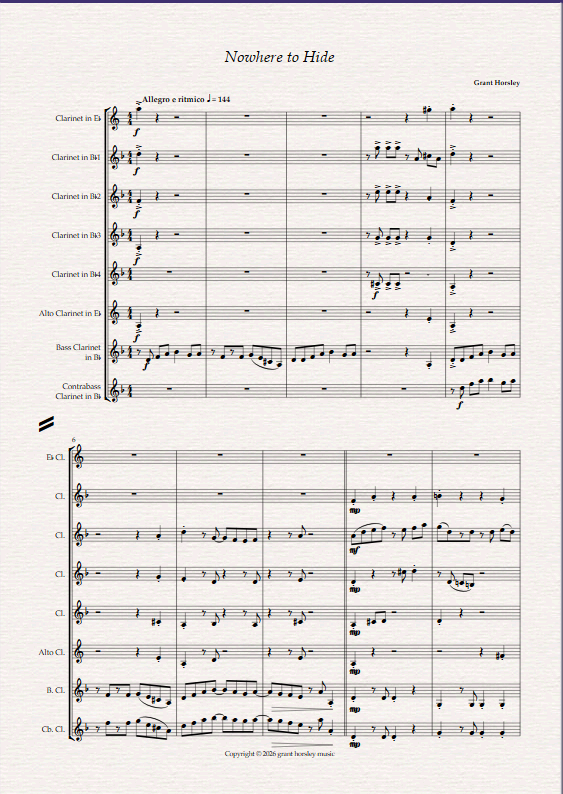 Scored for Eb Clarinet, 4 Bb Clarinets, Alto, Bass and Contrabass Clarinet. Nowhere to hide written in concert C minor is a very exciting piece depicting a pusuit of a person on the run rather like the subjects in some crime novels. After a short introduction the mood and pace to are set to signify the chase.