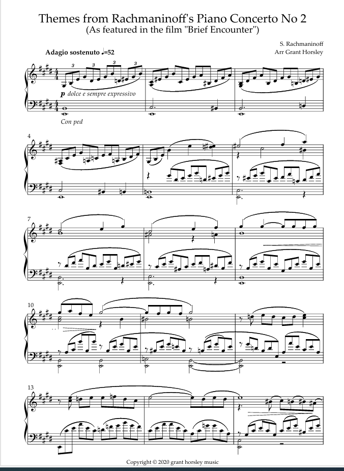 Originally for piano and orchestra and notably used in the film "Brief Encounter" I have carefully arranged the beautiful romantic themes of this piece for solo piano.